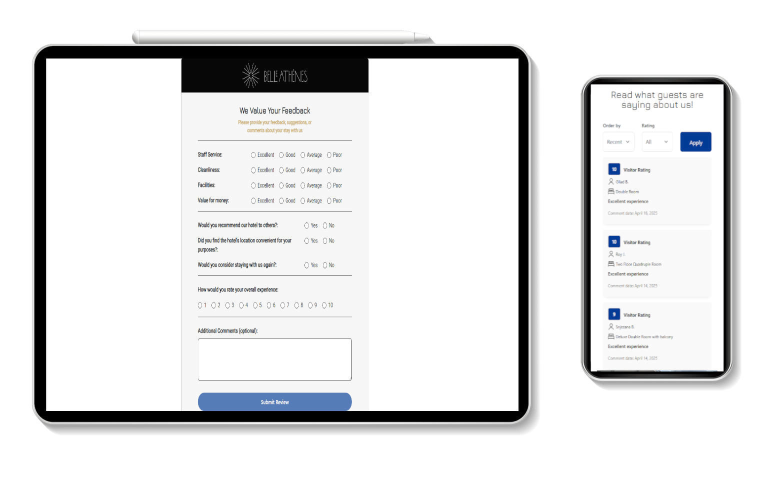 After each guest’s checkout date, an automated email is sent inviting them to leave a review. Each review link includes a unique token for validation, ensuring authenticity and preventing spam. Submitted reviews are securely stored and dynamically displayed on the hotel’s WordPress website.